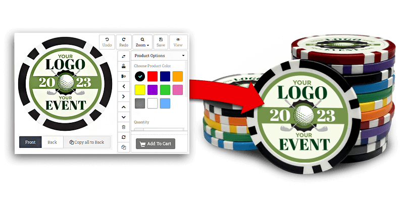 You can either design your personalized poker chips instantly online with our design tool or let our professional designers put it together for you at no additional cost. We have a team of graphic artists standing by to take your text, logo, photo or design to help create the perfect chip for you!